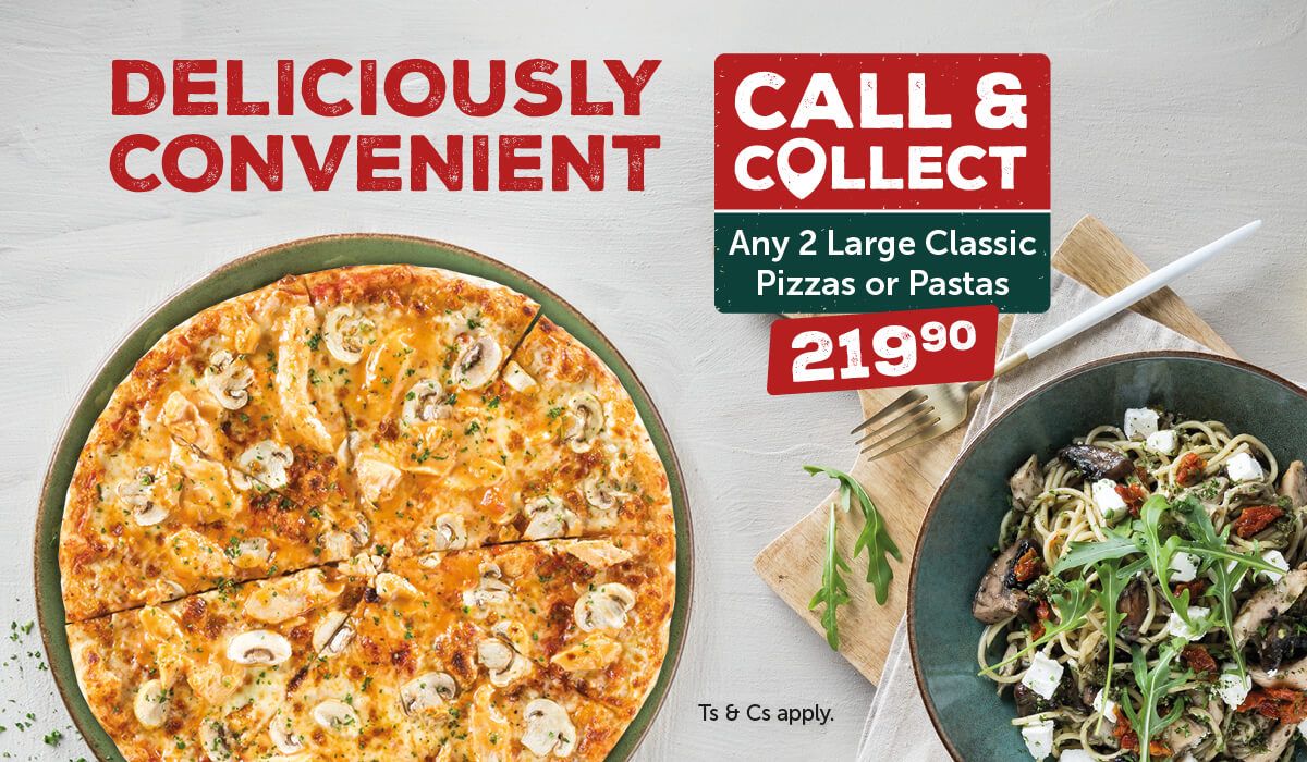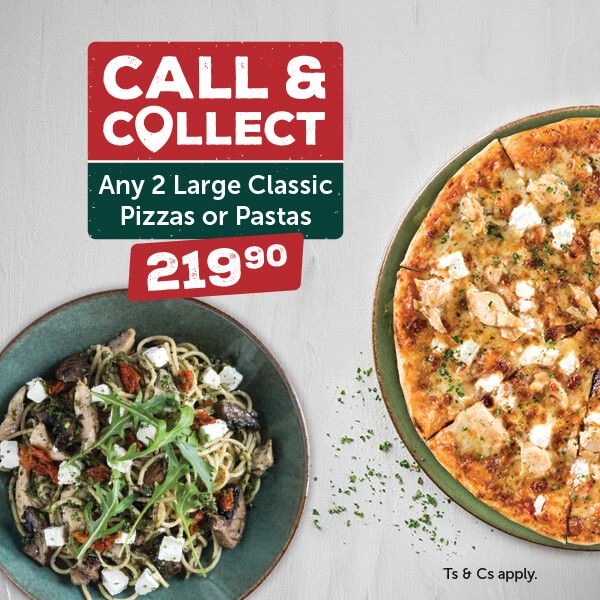 Take the fuss out of cooking and treat yourself to 2 delicious Large Classic Pizzas or Pastas for